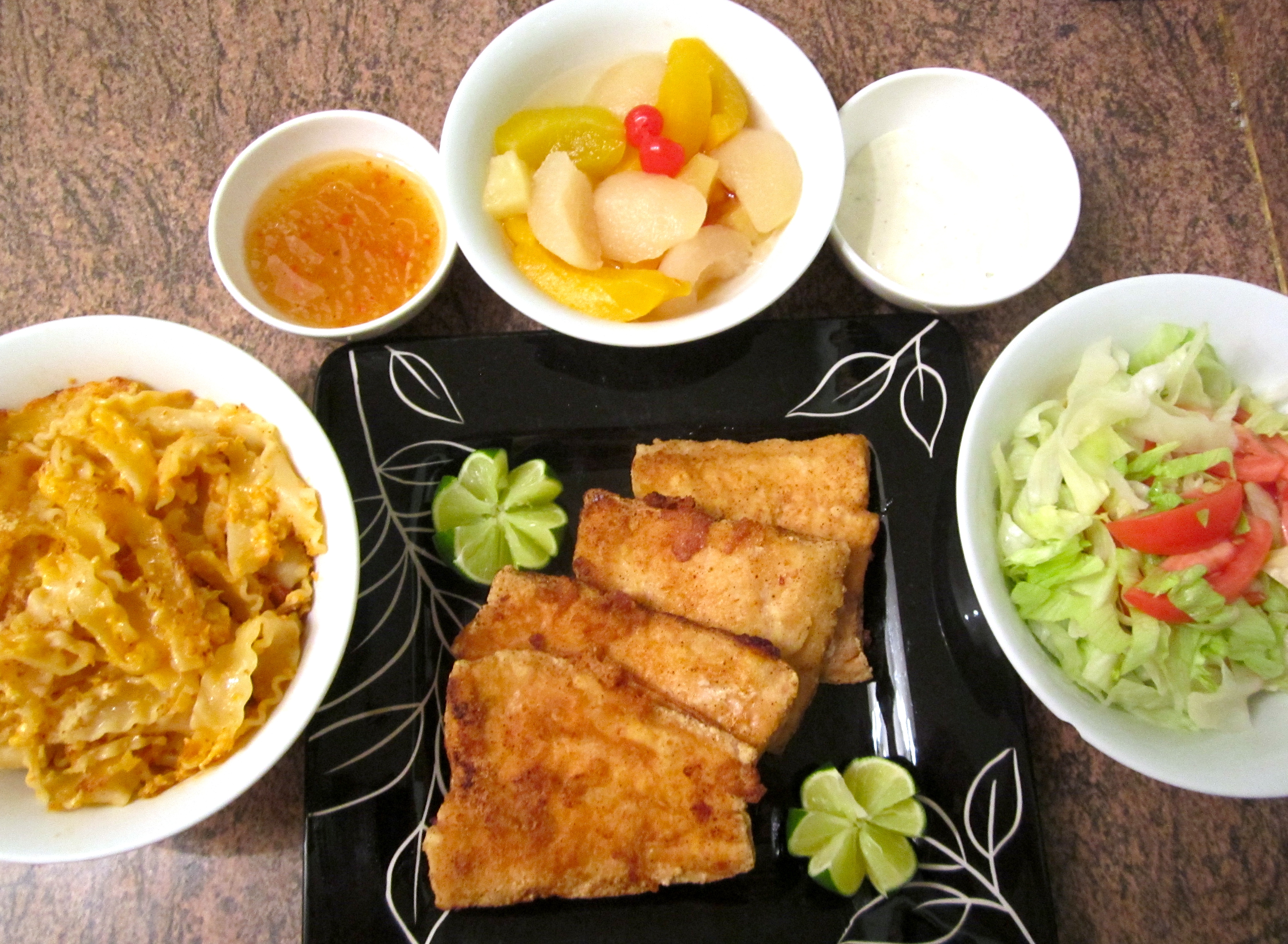 Pasta, Gouda & Sundried Tomato Casserole; Salad; Poached Fruits ”