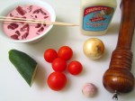 For the salad, simply mix cucumbers, tomatoes, onion and garlic with