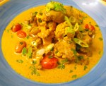 Traditionally, in Europe the general public did not know much about other countries ethnic cuisines ( with a few exceptions) until the late 50’s, early 60’s.When I was a young apprentice in the mid – 60’s, some of the more exotic dishes on our hotel’s menu were “Curries” usually shrimp or chicken, served with rice. These so called curries were a far cry from what we have learned and experienced by now what a curry is supposed to be. At that time, we did not make our own curry and masala mixes but rather used the ubiquitous “Curry Powder” , still to be found in most grocery stores around the world, available for those folks who want a quick fix of curry without the fuss. I have lived for some years in Pakistan and in South East Asia, as well as having visited India on many occasions. I consider myself an absolute devotee of curries in all of it’s myriads of incarnations. However, I am also a big sucker for the dishes of my home and my youth, so sometimes I have to make a decision which route to follow on that particular day for a particular dish or style of cooking. Yesterday the curries of my youth won out. The creaminess that is so characteristic of our old fashioned “curries” and the inclusion of fruit into the sauce ( apples, bananas, pineapples) has an appeal all of it’s own to me.