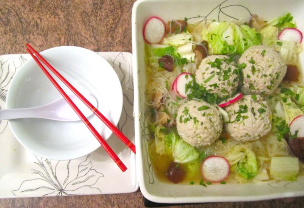 Pour in the chicken stock. Bring to a boil, then lower the heat to a simmer. - Shape the pork mixture into tennis ball size balls.