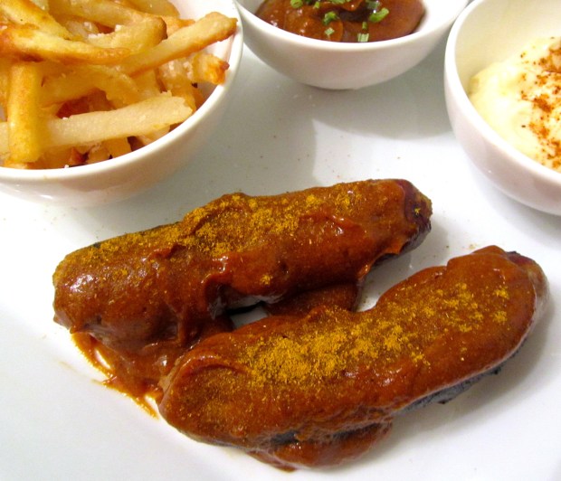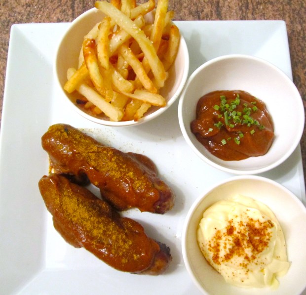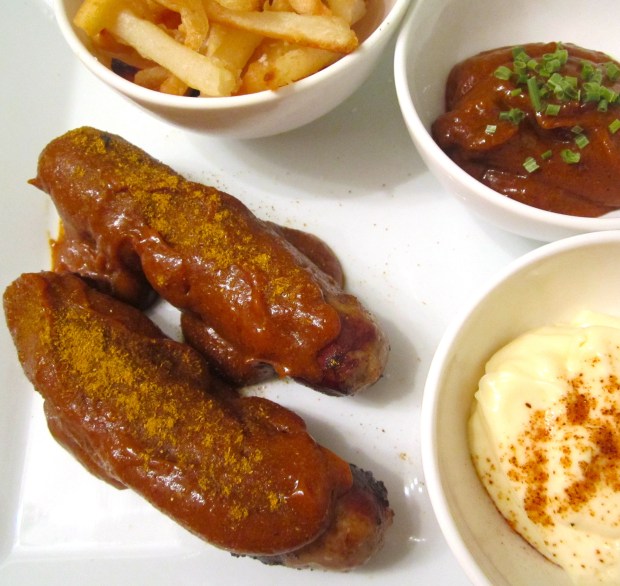 A post worth writing / reading you ask ? Well, if you ever had a good curry wurst, you start salivating just by reading the title. If you never had one, you might shake your head in disbelieve. What could be so special about a sausage drowned in curry-ketchup ? What the heck is curry ketchup ? Like many things in life, a mere description can never do justice to the actual experience of eating the real thing. I for one love my caviar, foie gras, lobster and so forth. But as you must have realized by now, I just as much appreciate the simpler thing’s in live. “Curry wurst mit fritten” certainly is one of them. Now, there are many different sausages suitable for this dish, but since I live in the states, it is more difficult in certain areas to source good quality sausages. However, I have access to very good mild Italian sausages which fit perfectly. As for the curry sauce, many elaborate sauces have been concocted over time, some more, most less successful. What works best for me is a quality ketchup mixed with roasted garlic puree, good quality curry powder and a bit of salt. That’s it ! Please don’t knock it before you tried it. I have surprised many a chef over the years with this simple sauce (condiment), most of whom were eager to get the “secret recipe”. Important also is to sprinkle a fair amount of the curry powder over the sauced sausage just before serving. I can think of no other dish in the world were I would suggest that, but here it works just beautifully. Also very important are first class, crispy french fries, sprinkled generously with sea salt and dipped into mayonnaise. Yep, the comercial kind of mayo works best here. Save the good home made stuff for something else 🙂