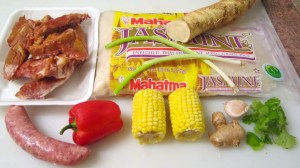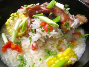Saute garlic and ginger in peanut oil until fragrant. Add water and pigstails. Simmer pigstails in unseasoned water for about an hour or until starting to become tender. Taste stock and if necessary season with salt and pepper. (Some smoked meats can be overly salted, so don’t season at first) Add rice and very slowly simmer for another hour or until the rice is close to the texture you desire. Now add the corn, diced peppers and sausages. Simmer for another fifteen minute. At this point, adjust texture and seasoning if necessary. If the congee is too thick for your liking, add some hot stock. If it is too thin, simmer longer or strain some of the liquid.