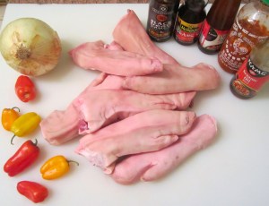 You name it, I love it. On the weekend I have increased my repertoire by yet another version, this one being my new favorite. The preparation is minimal and the final outcome is easily controlled by your final adjustment (or lack thereof) of seasoning. Blanch trotters in salted water. In a good sized pot, add the trotters, water, soy sauce, sriracha, oyster sauce, fermented black bean sauce and sesame oil, diced chilis, diced onions. Bring to a boil, turn down to a simmer and cook until trotters are very soft but not falling apart. Remove trotters. The cooking liquid should have reduced and slightly thickened. If still too liquid, reduce further until desired texture is achieved. Strain. Add some more diced chilis for color and simmer for two minutes. Adjust seasoning to your liking. Return trotters to sauce and reheat. To serve, sprinkle with sliced scallions.