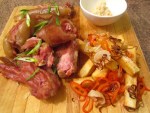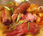Simmer the smoked pigs’ tails in salted water with kosher salt, lot’s of garlic and cayenne pepper until very tender but not falling apart. Grate the horseradish very fine and mix with salt and lemon juice. Fry the potatoes in rendered duck fat, starting with cold fat and slowly increasing the temperature to 375 F. The potatoes will be creamy on the inside and crispy on the outside. Add the sliced chilis and onions for the last few seconds of frying. Remove to absorbent paper and sprinkle with sea salt.