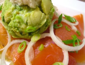 Smoked salmon, sautéed garlic potatoes, Guacamole, onion, freshly grated horseradish with lime.