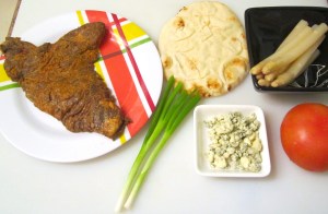 Season steak with kosher salt, dust with a mixture of ap flour, cornstarch, cayene and garlic powder , saute in oil until bloody rare (or your preference. (See note below). Place naan on a baking rack. Top with steak. Sprinkle with asiago. Top with tomato. Sprinkle with asiago . Top with asparagus. Top with gorgonzola. Top with scallions. Broil until gorgonzola is melted and get’s a few golden spots. Remove from broiler, sprinkle with chili flakes. Enjoy a great meal ! 🙂