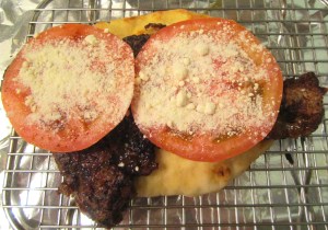 Tomatoes, sliced thick, seasoned with kosher salt and cayenne pepper