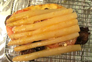 Asparagus spears, (white or green, depending on availability and your preference), buttered and seasoned with kosher salt and cayenne pepper