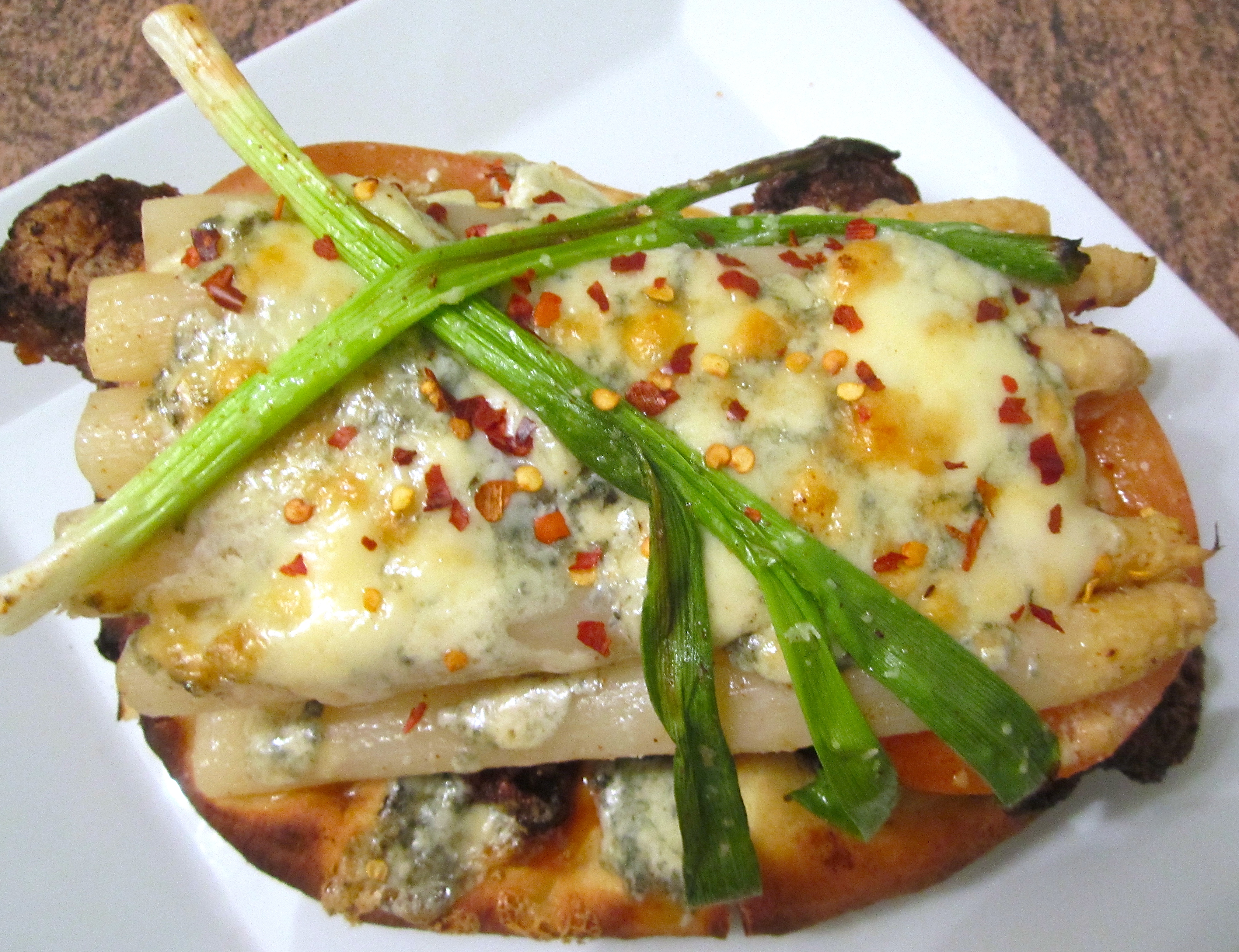 Gorgonzola Gratinated Skirt Steak, Tomato & Aparagus On Naan