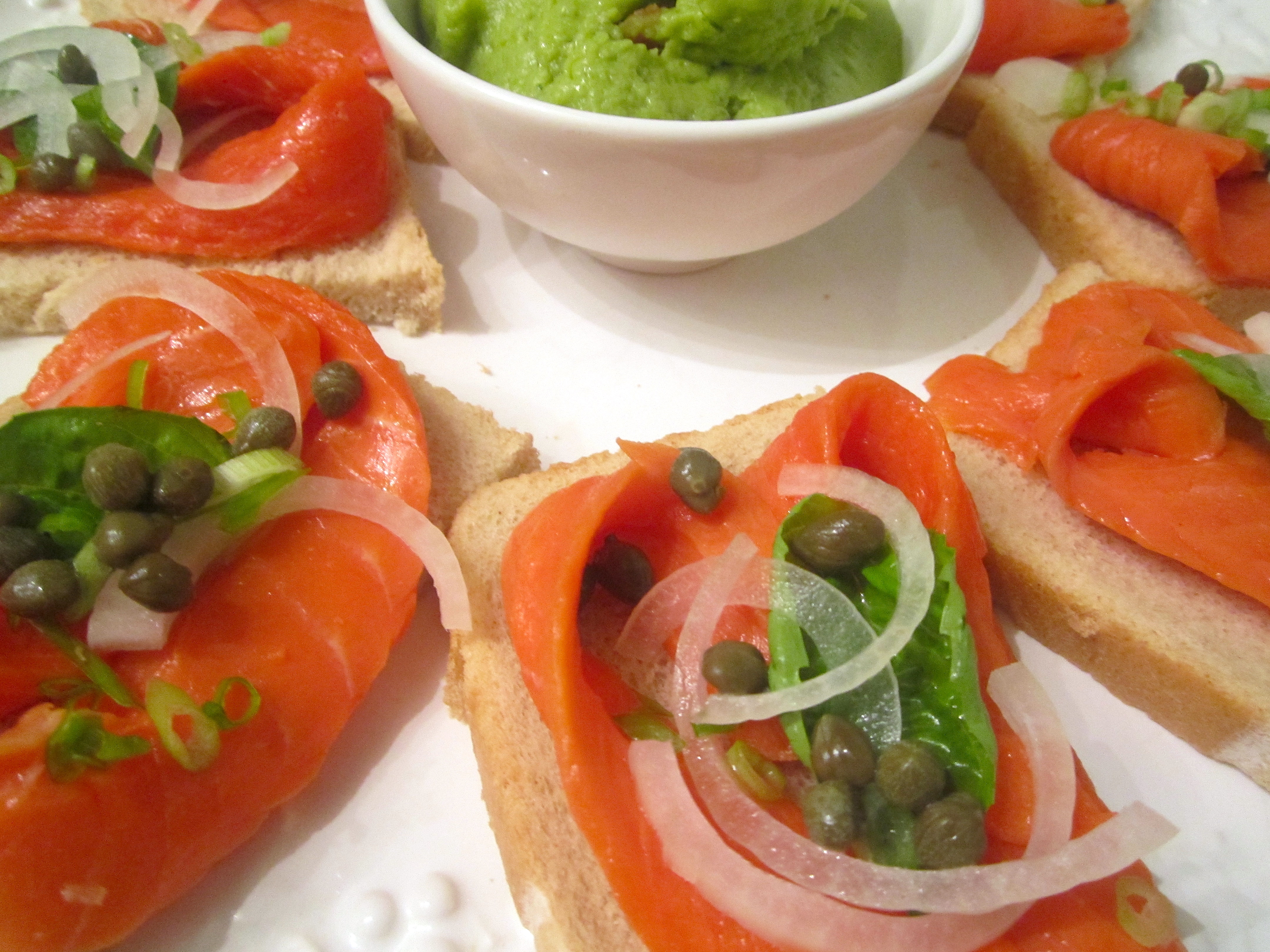3 ← Previous Smoked salmon, sour dough bread, garlic butter, sliced onion, capers, basil leaves, guacamole.