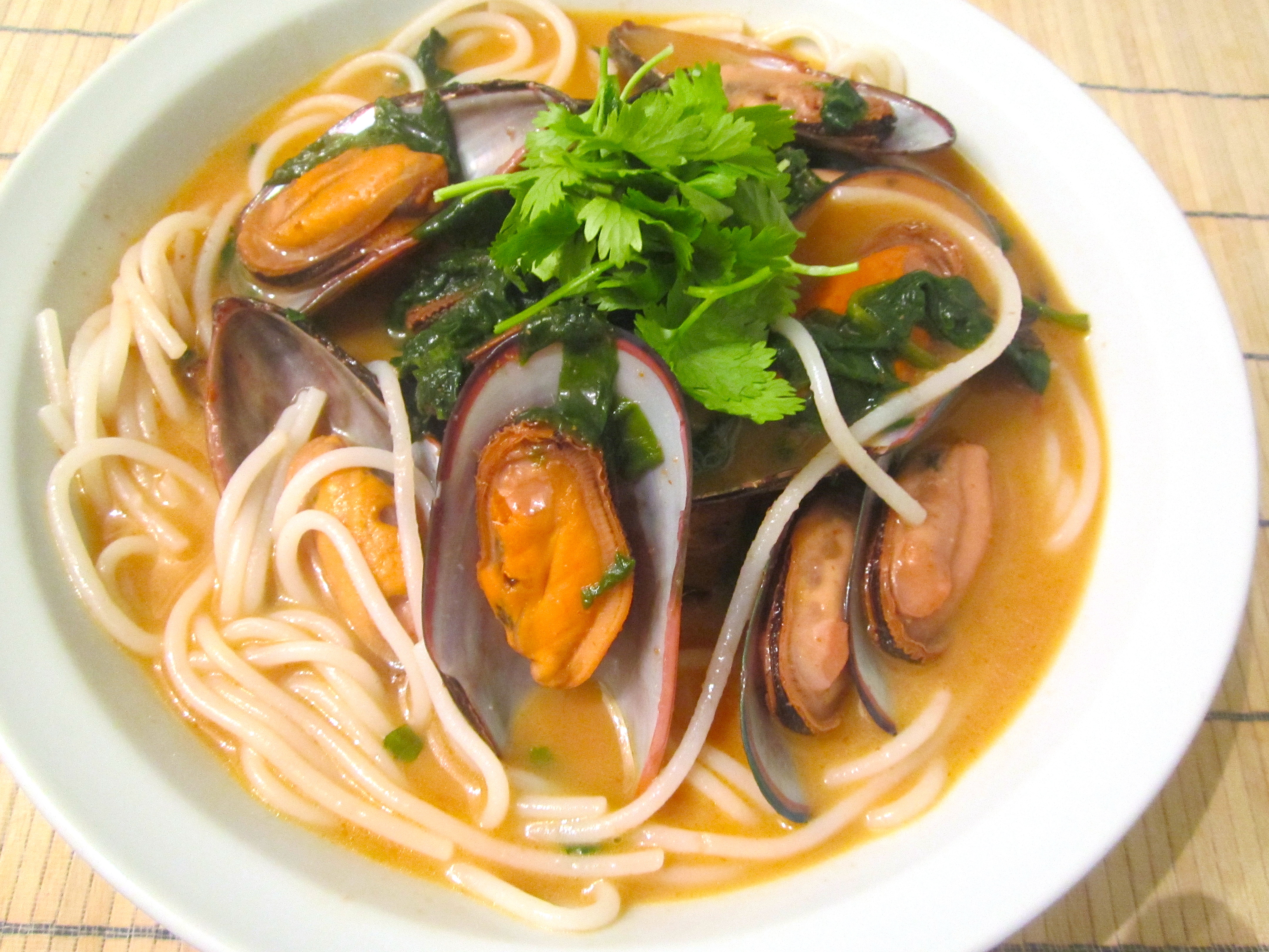 2 ← Previous Next → Green Lip Mussels, Lai Fen Rice Sticks And Chopped Broccoli Rabe In Red Curry/Coconut Soup