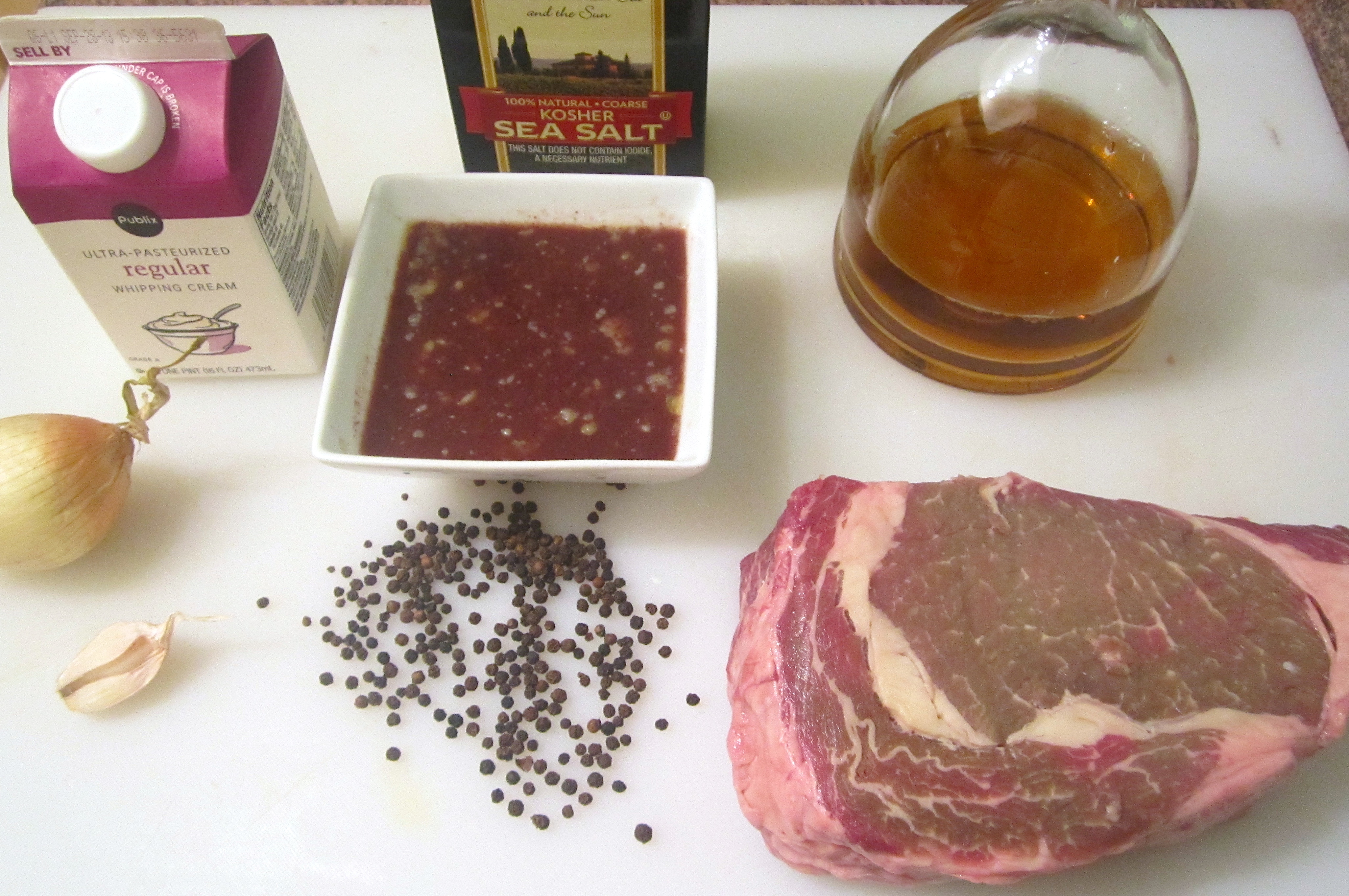 Rib Eye, Red Wine Jus, Cream, Whole Black Pepper CornSea Salt, Cognac