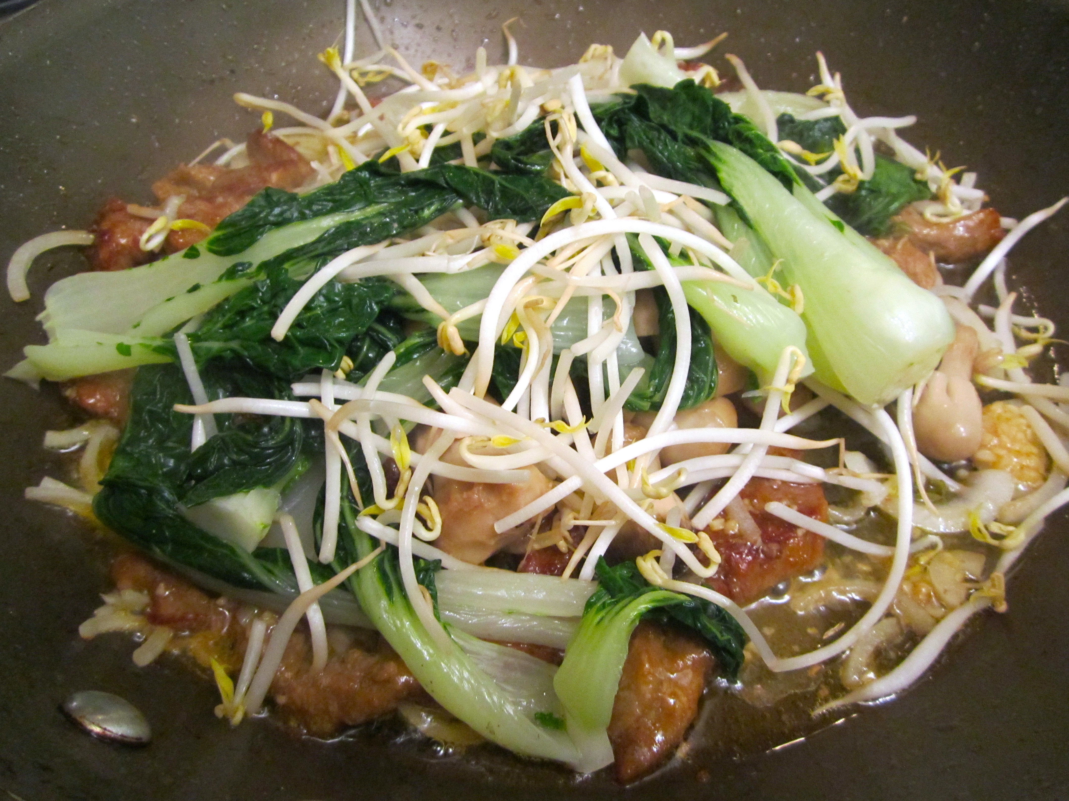 Add blanched bok choy and bean sprouts, saute until heated through.