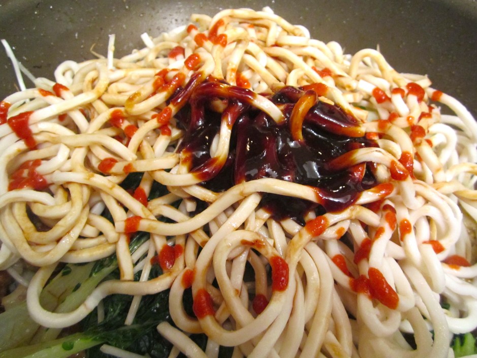 4 ← Previous Next → Add freshly cooked and drained udon noodles, hoi sin sauce, soy sauce, sriracha and maggi seasoning. mix well.