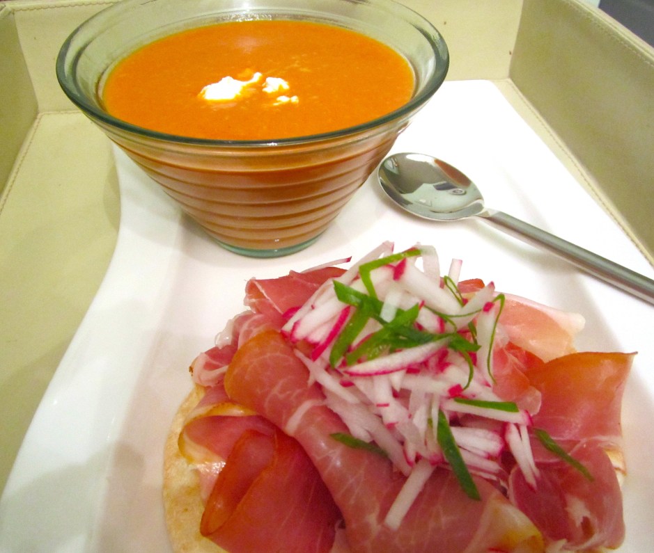 Tomato bisque & jamón serrano sandwich with boursin cheese on pita bread