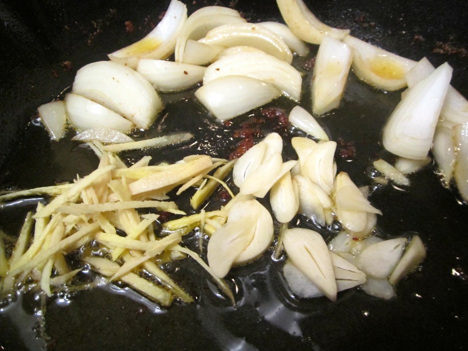5 ← Previous Next → Stir fry onions, garlic slivers, crushed szechuan peppercorns and ginger julienne until fragrant