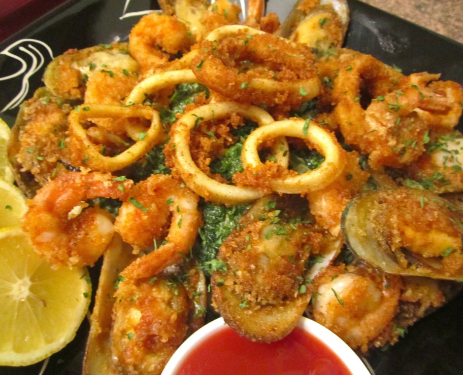 Fried Seafood, Creamed Spinach & Tonkatsu Sauce