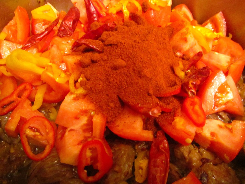 add chopped tomatoes, chilies, sweet paprika, small amount of kosher salt
