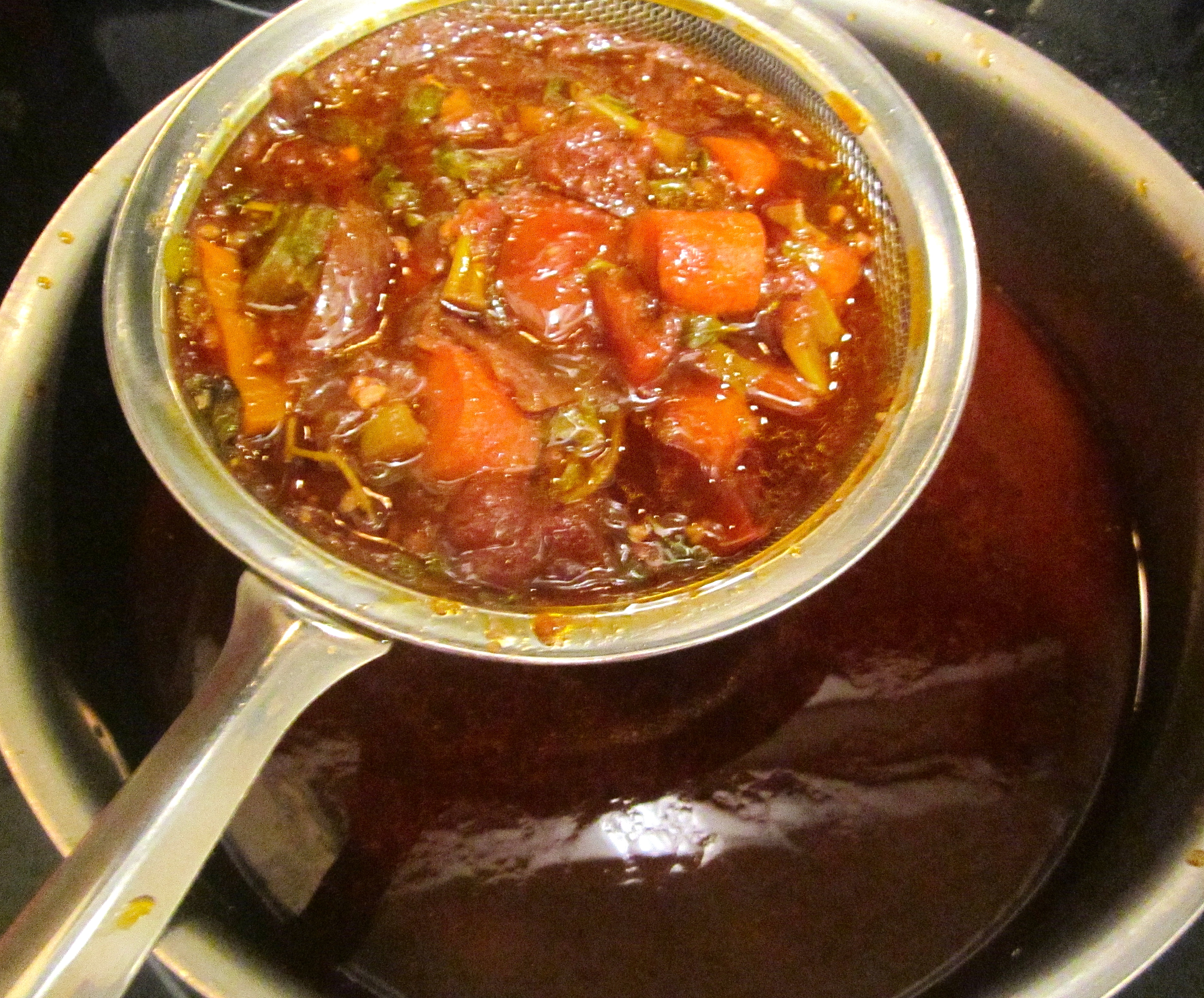 9b ← Previous Next → strain vegetables, making sure to press as much vegetables as possible through the strainer to thicken the sauce and add even more flavor. Simmer and reduce until “Nape “texture. Check/adjust taste