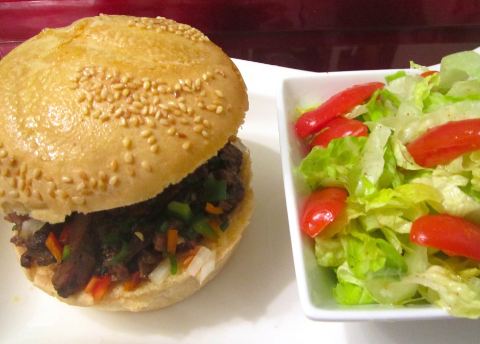 short rib sandwich with romaine and tomatoes in dijon vinaigrette