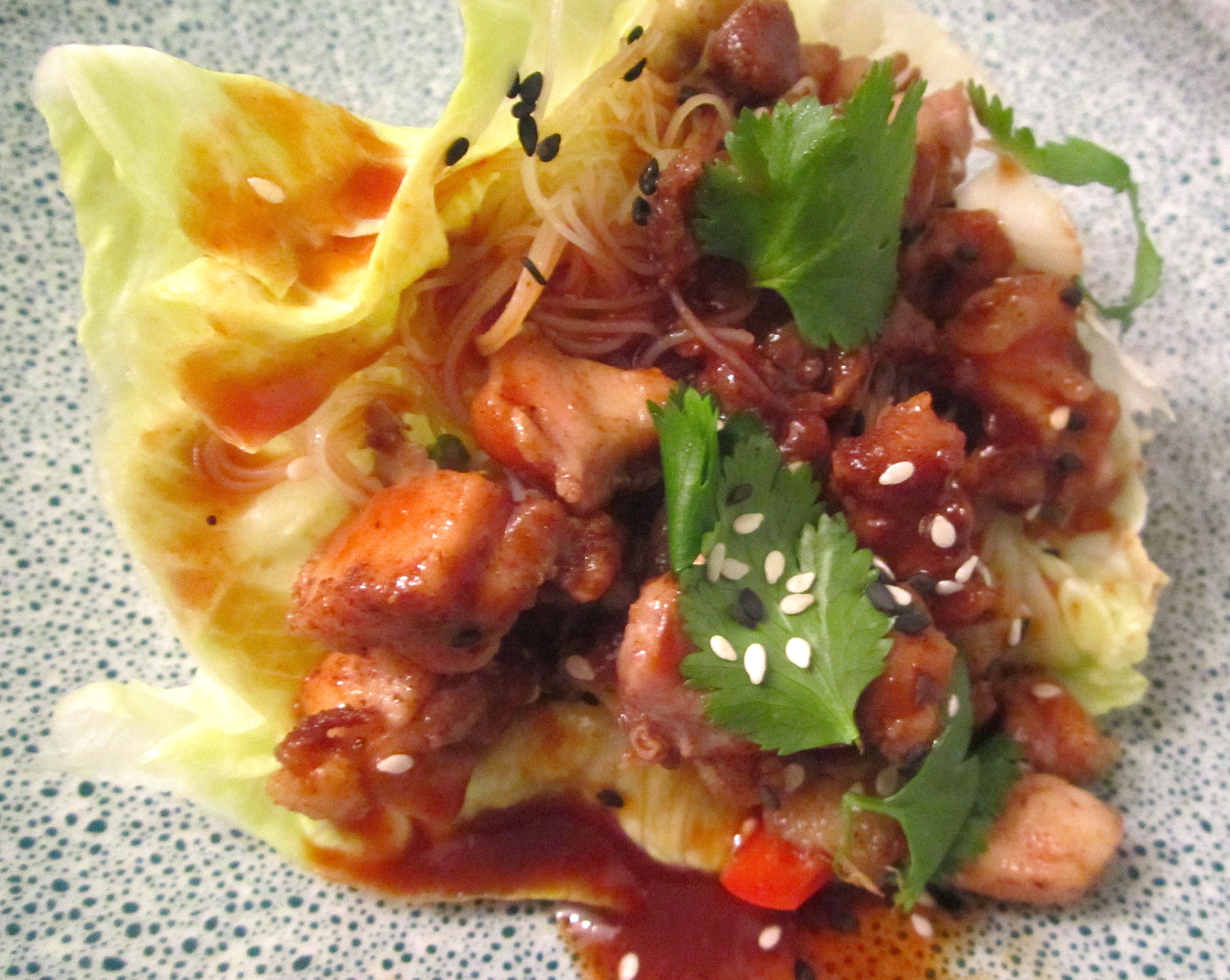 Lettuce Cup With Spicy Chicken And Dirty Rice Sticks