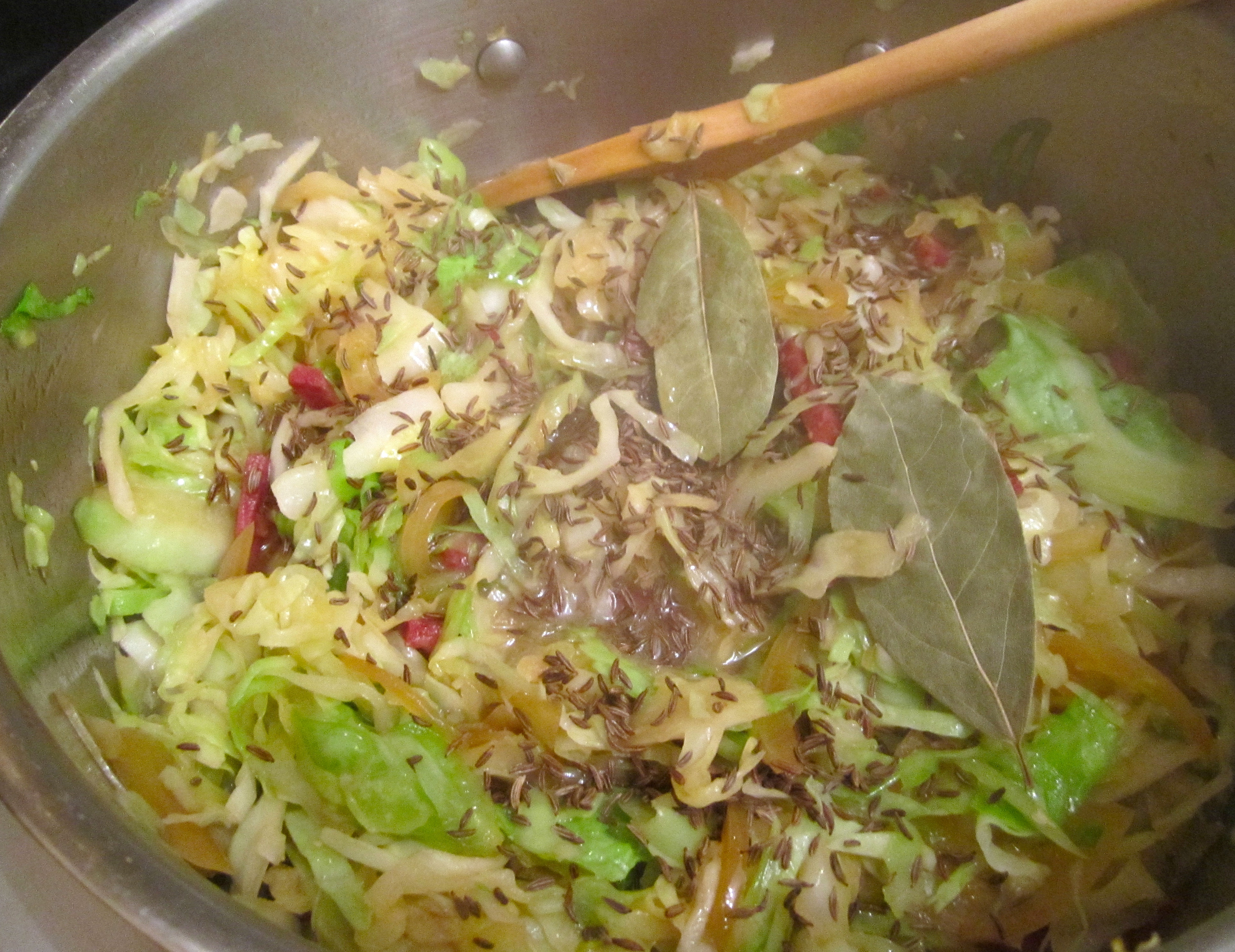 add finely sliced white cabbage, bay leaves and caraway seeds