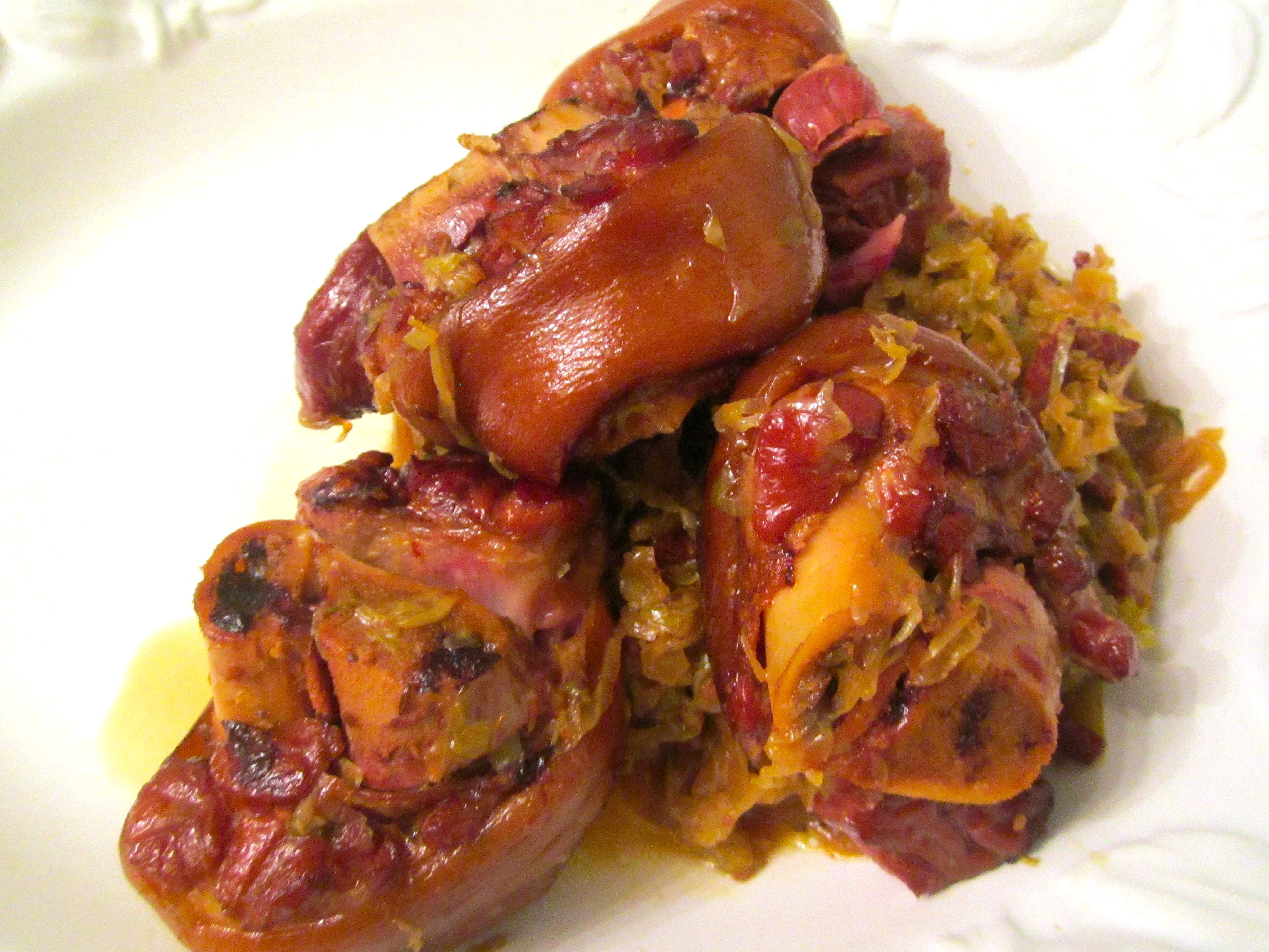 8 ← Previous Next → Once the pork knuckles are very tender without falling apart, remove from stock and bury in the cabbage. Let cool and store overnight in fridge. Next day, reheat and serve with sauteed parsley potatoes. Serve with mustard and horseradish