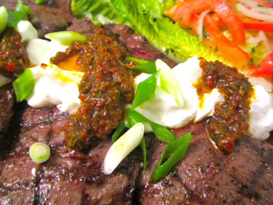 5 ← Previous arrange salad and steaks on serving platter, top steaks with spicy chimichurri and greek yoghurt