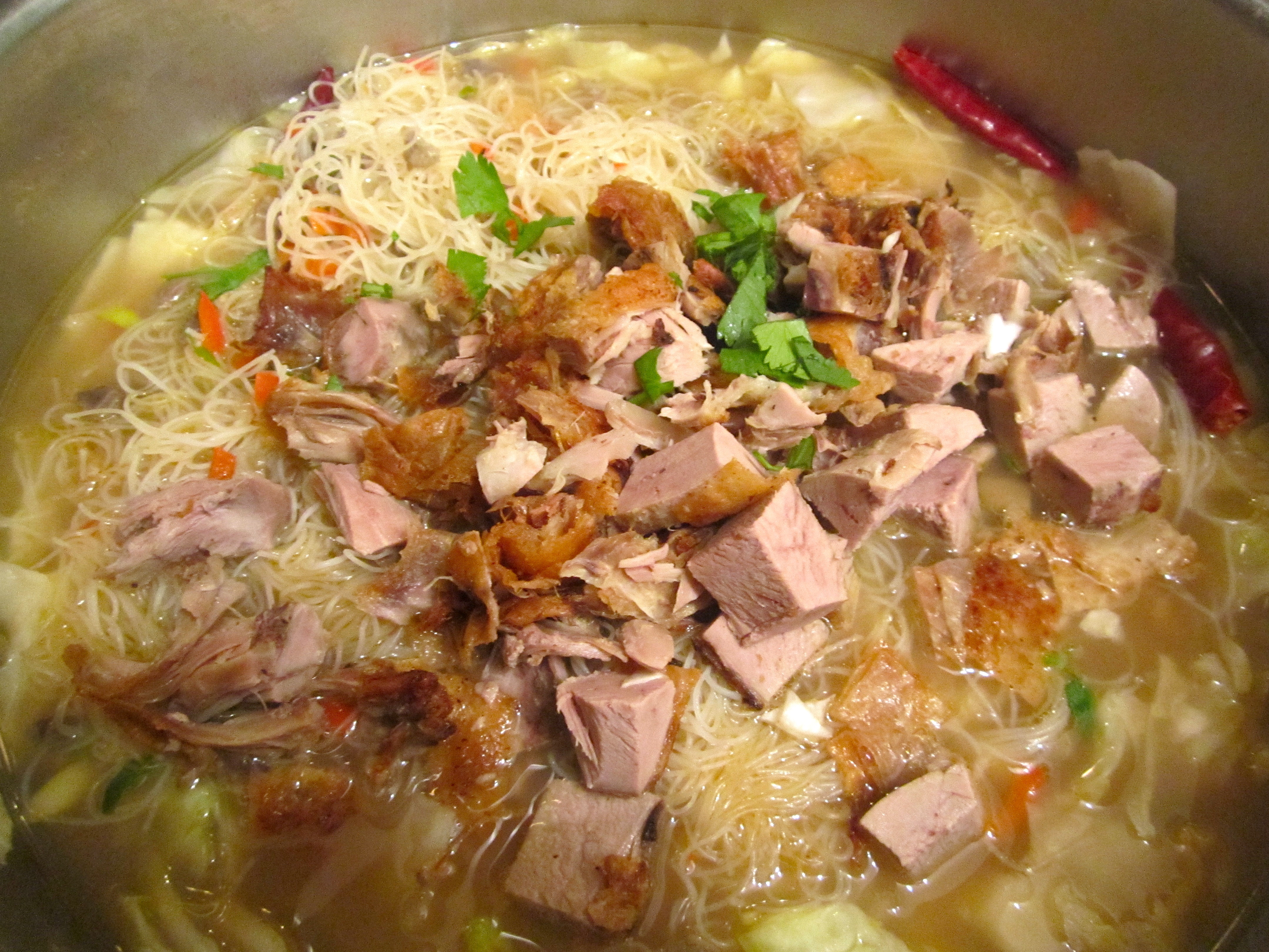 3 ← Previous Next → add vermicelli, diced leftover duck, cilantro and diced red peppers to soup. Bring back to a simmer, remove from heat at once. To serve, sprinkle with more cilantro