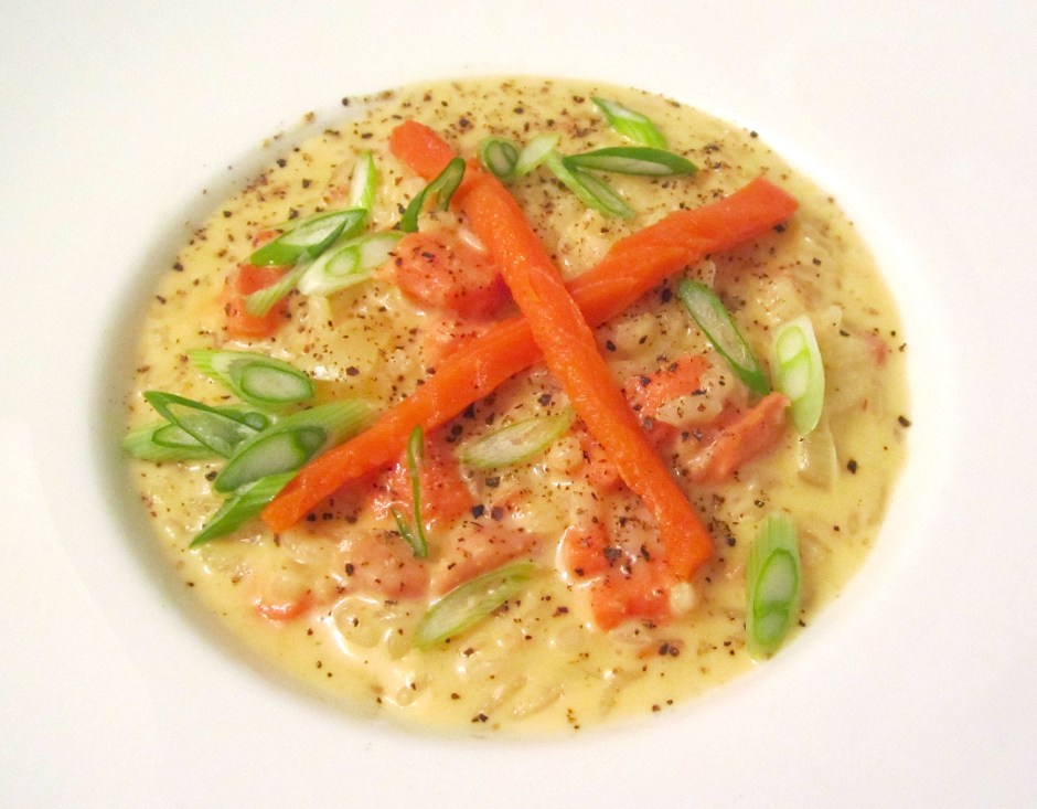 finish with more smoked salmon and finely sliced scallions