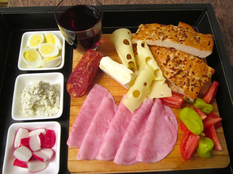 1 Next → onion/garlic -focaccia, ham, emmenthaler, salame, brie, boiled egg, boursin, salted radishes, salted tomatoes, chilies & merlot