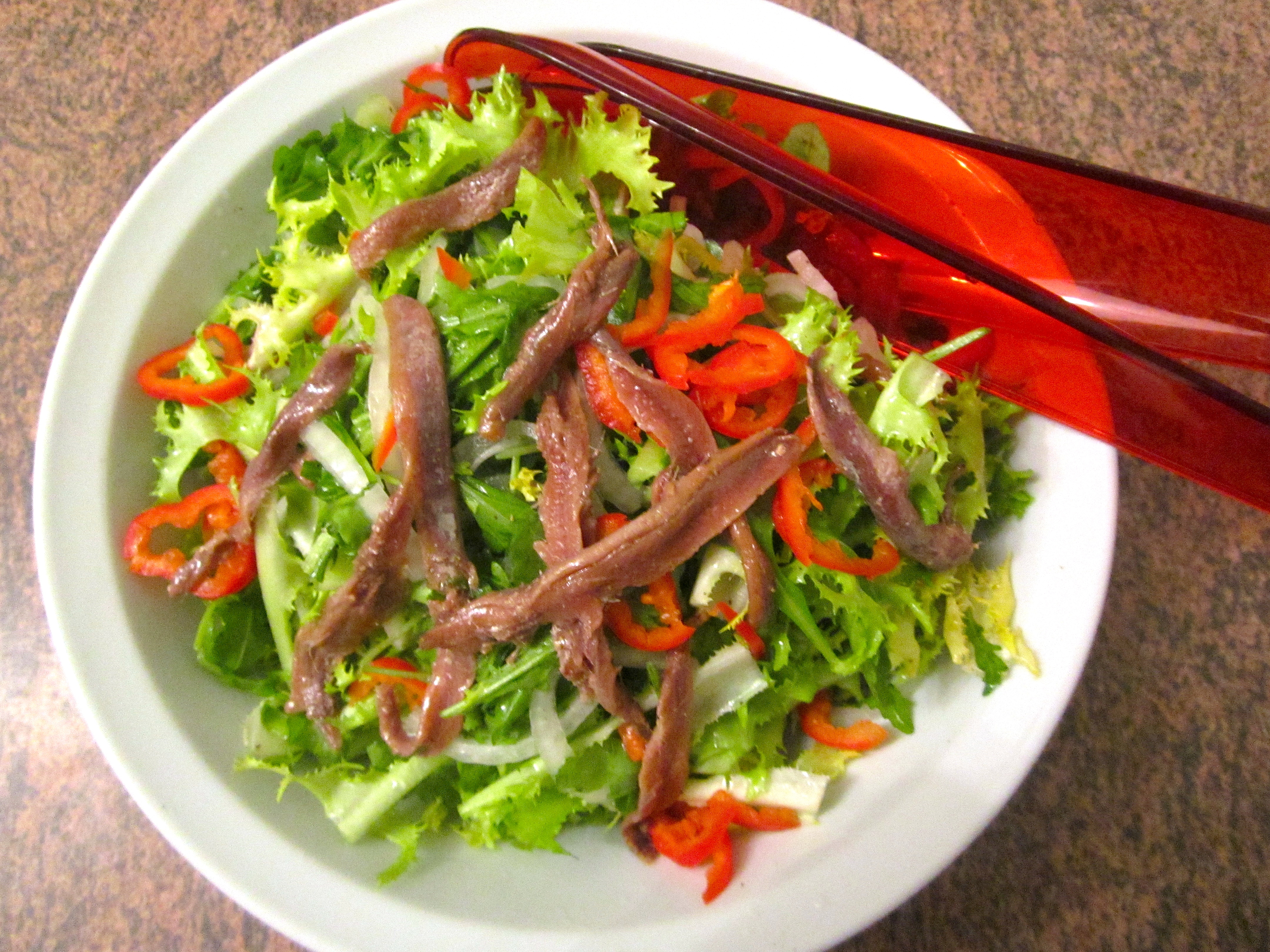 frissee, arugula, onions, chilies and anchovies in dijon vinaigrette