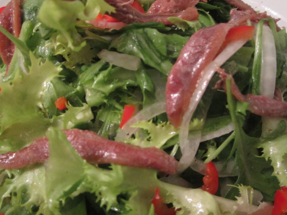 frissee, arugula, onions, chilies and anchovies in dijon vinaigrette