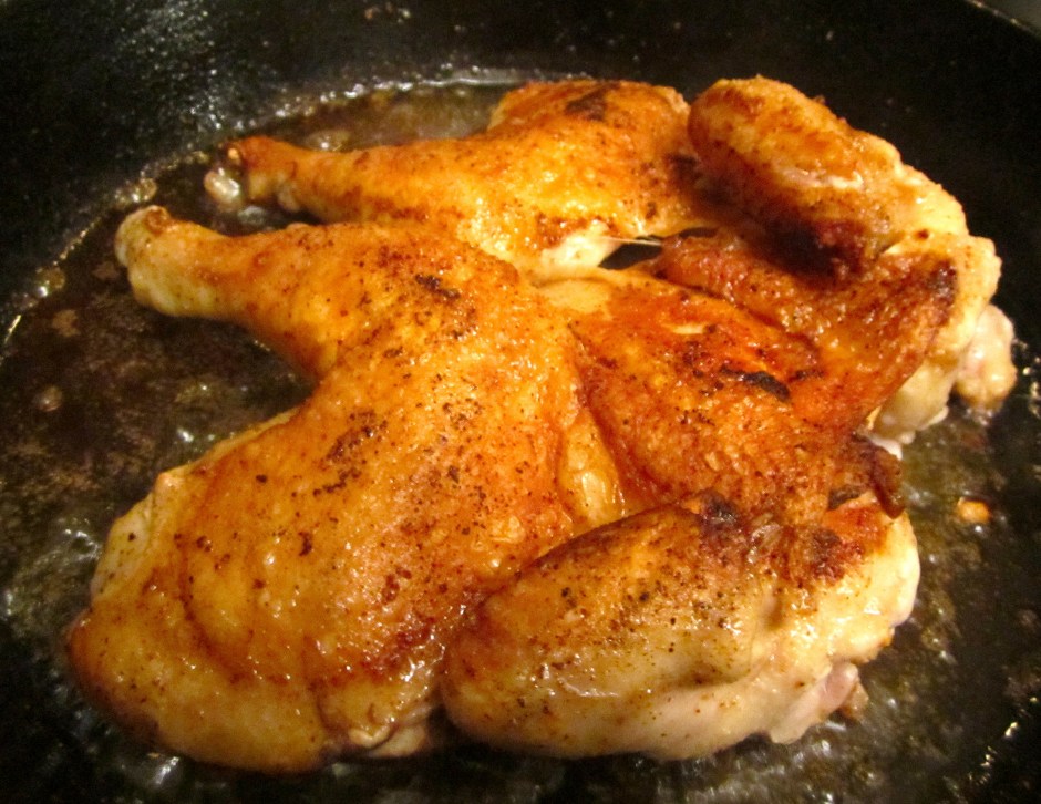 2 ← Previous Next → cut hen in half, remove back bone, season with kosher salt and cayenne pepper, saute in garlic oil until cooked through but not dry
