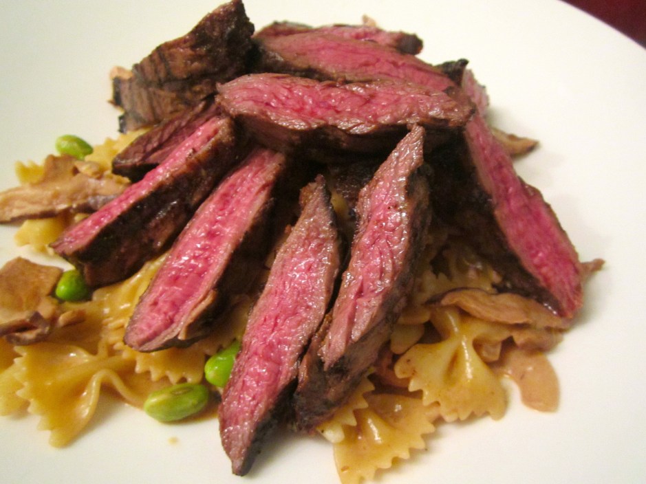 Grilled Skirt Steak With Shiitake Farfalle And Edamame