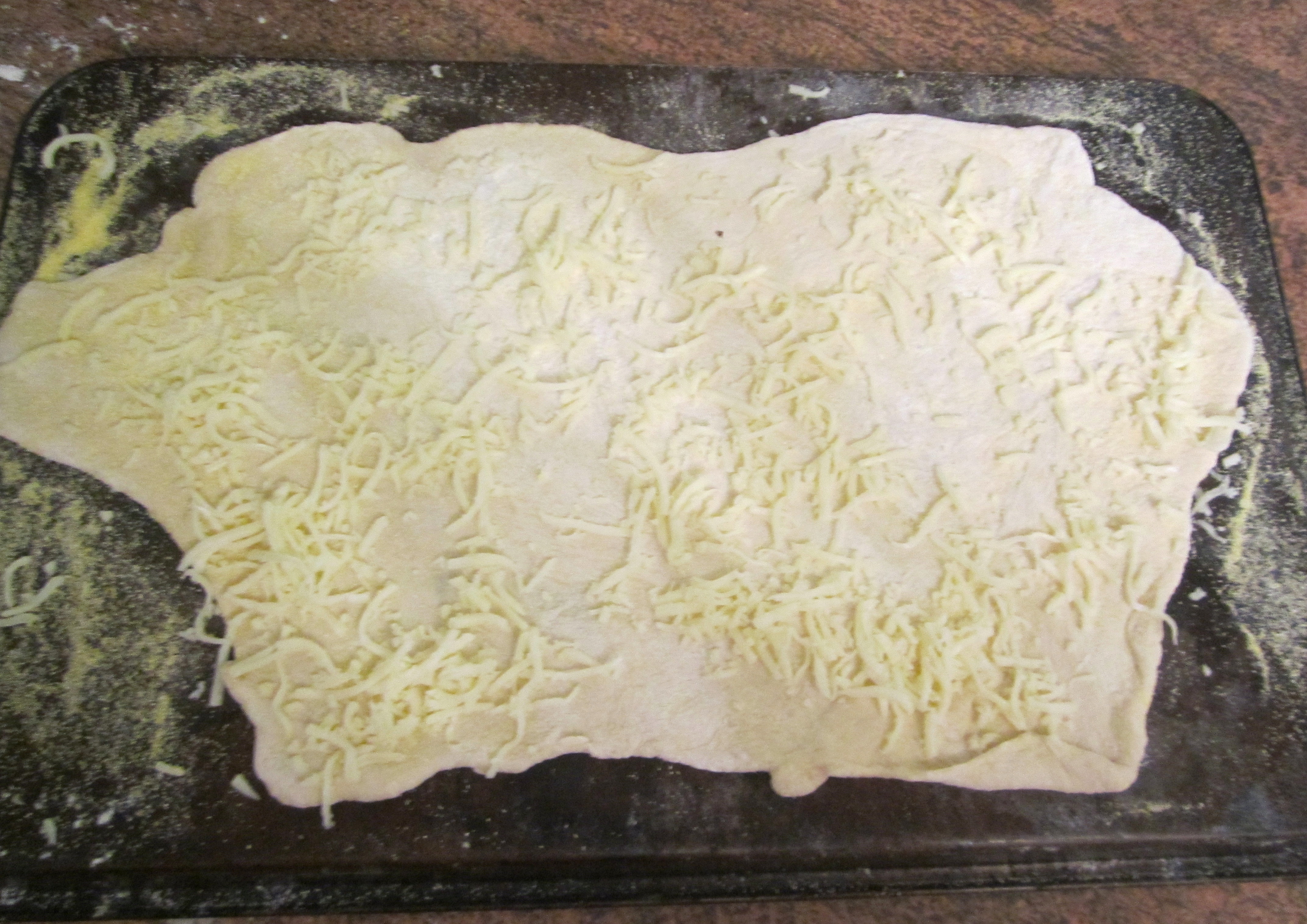 roll pizza dough, place on cornmeal dusted sheetpan, sprinkle with mozzarella