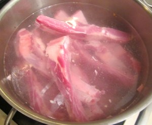 - simmer ribs in water seasoned with vinegar, hot sauce, kosher salt and lot’s of garlic paste