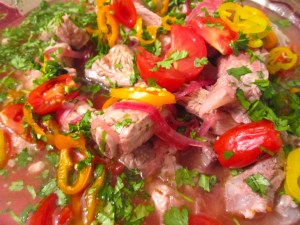 - when ribs are tender, transfer to a hot dressing made of vinegar, kosher salt, garlic paste, hot sauce, red onions, tomatoes and sliced chiles, let cool to room temparature, sprinkle with oregano and cilantro