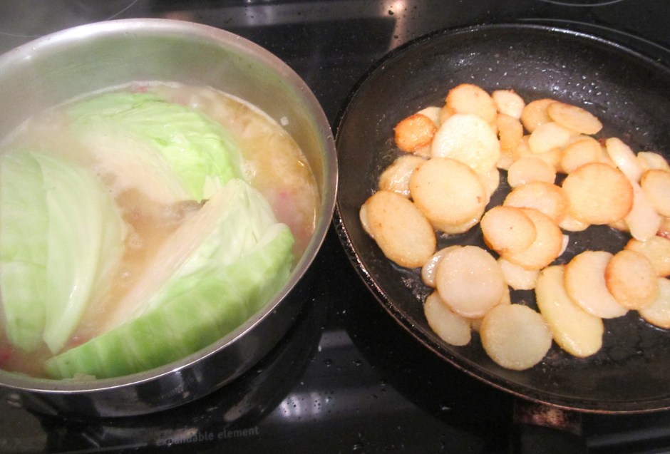 meanwhile, saute blanched potato slices in duck fat, season with salt and pepper