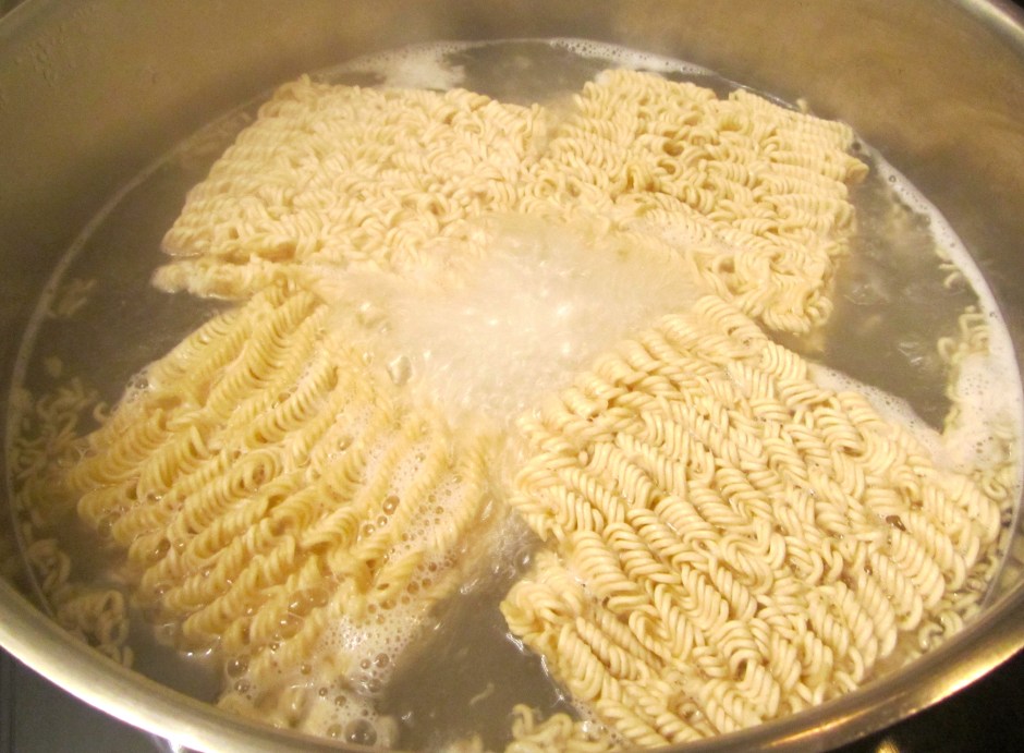 1 Next → cook instant ramen noodles in boiling salt water for one minute, strain, coat with sesame oil