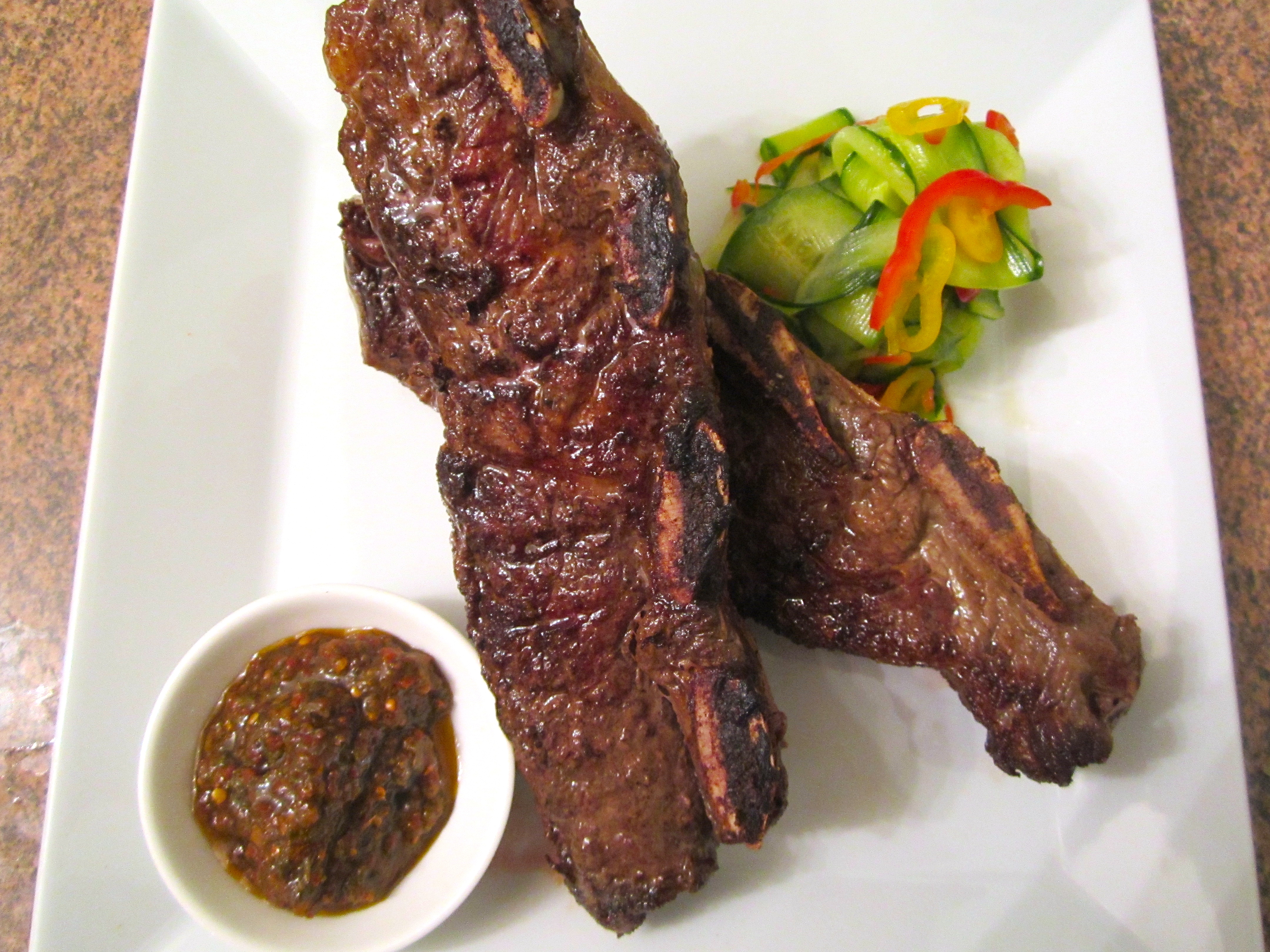 Grilled Beef Rib’s, Spicy Chimichurri, Asian Style Pickled Cucumbers