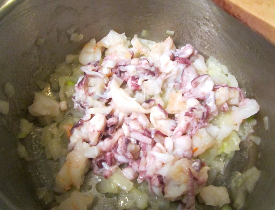 add coarsrly chopped squid tentacles and coarsely chopped shrimps, saute briefly