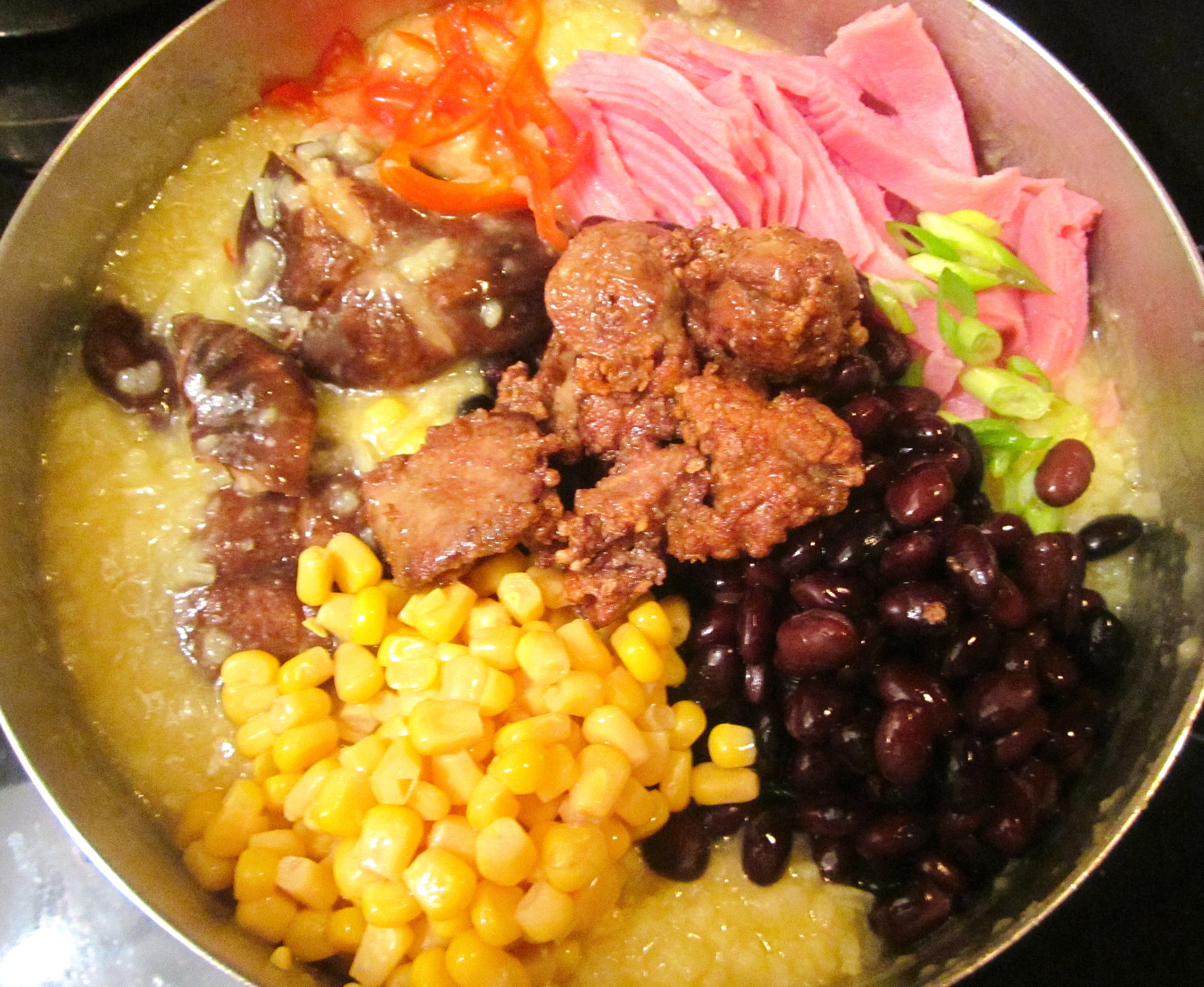 5 ← Previous Next → to porridge add livers, beans, corn, mushroom, chilies, scallions and sesame seed oil, check/adjust seasoning