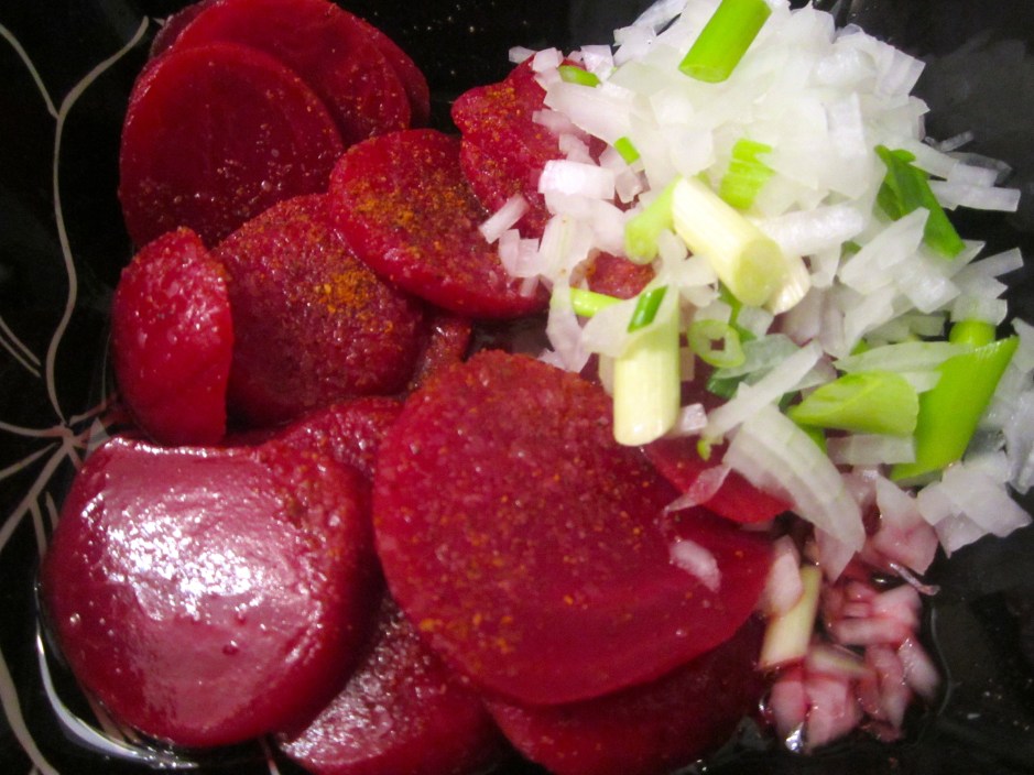 7 ← Previous Next → meanwhile, make a salad of red beets, raspberry vinagrette, diced onions and sliced scallions