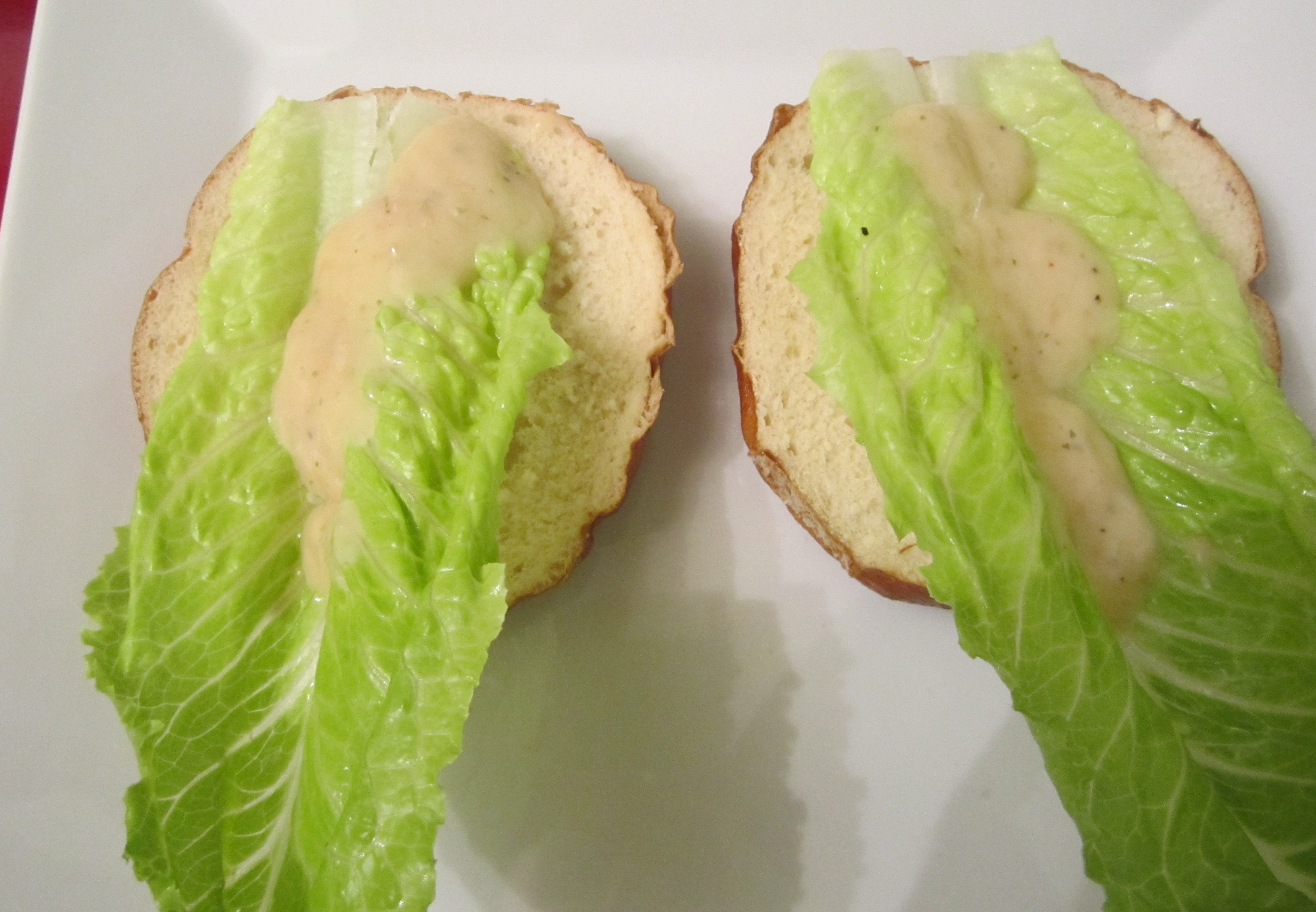 2 ← Previous Next → cut 2 bretzel rolls in half, reserve 2 top parts, top with romaine leaf and garlic aioli