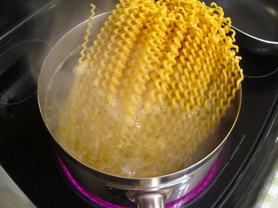 boil fusilli al buco until al dente, strain, reserve some of the cooking liquid
