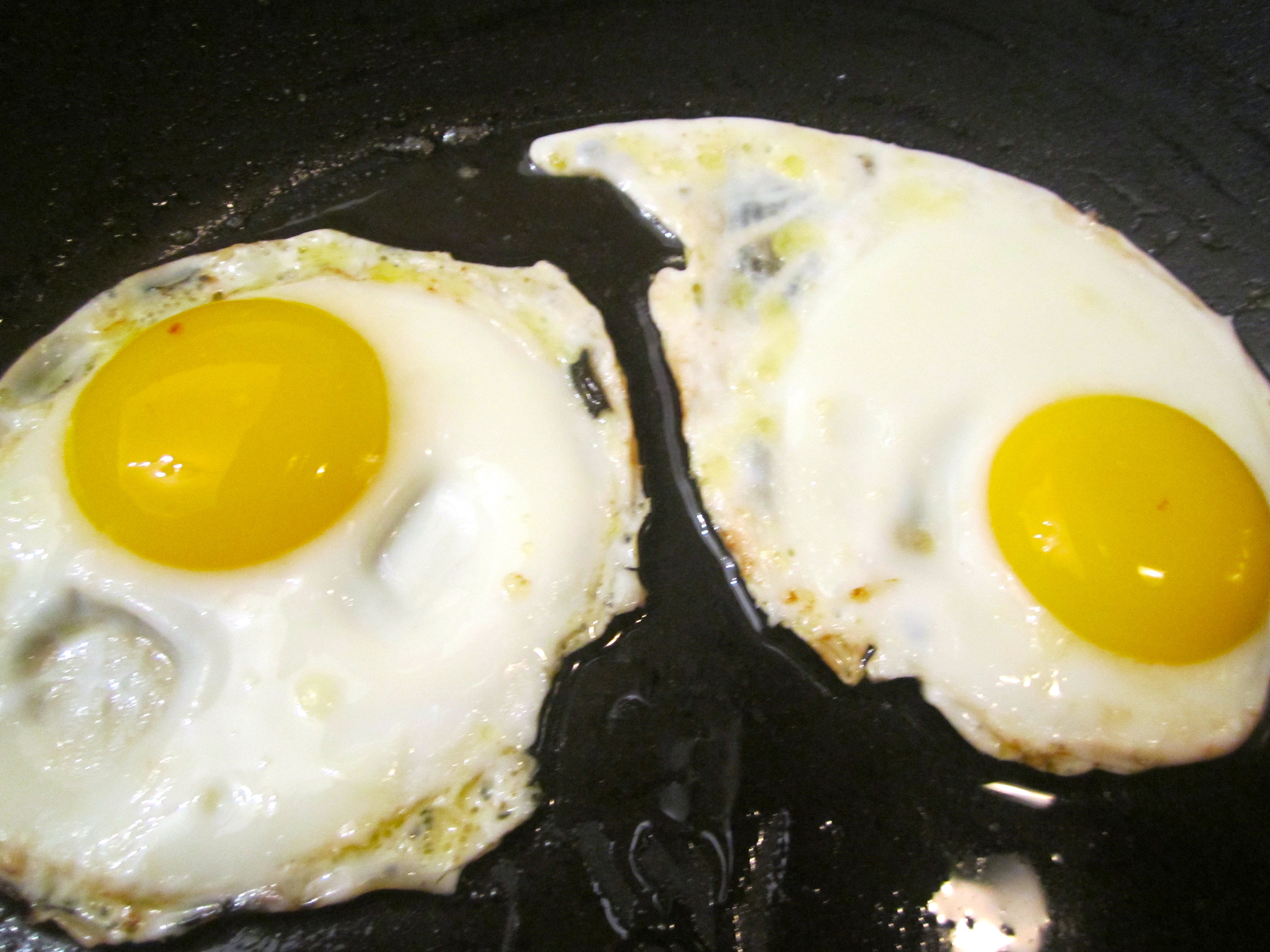 meanwhile, fry eggs, season with cosher salt and chili flakes