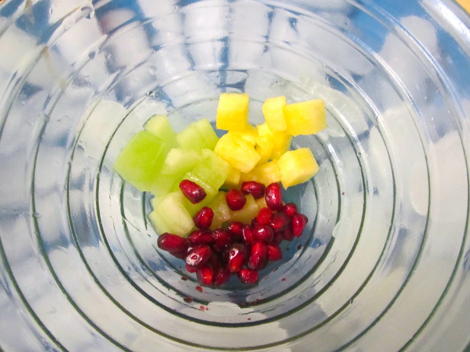 add fresh pineapple, honey dew melon and passion fruit seeds to serving bowl