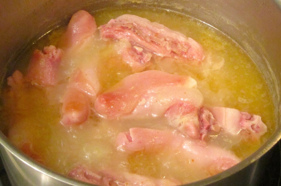 1 Next → remove tails from brine, rinse under running water for 15 minutes, cover with cold water, season with cider vinegar, garlic paste and hot sauce, simmer until tender but not falling apart, about two hours