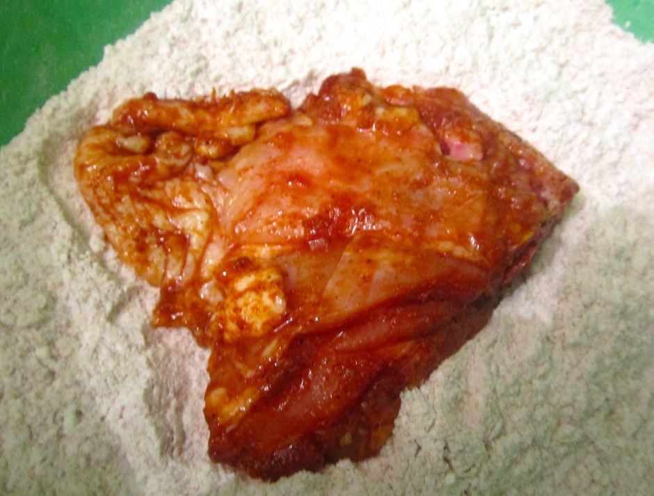 dredge chicken in seasoned flour